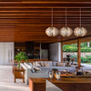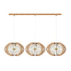Le trio de suspensions du lustre ECHINO de 39 cm de diamètre chacune, sont tressées à la main sur une structure composée d'arcs en bois. L'élégant bandeau en bois de forme rectiligne habillera votre plafond en toute subtilité. La hauteur du lustre est totalement modulable et permet d’adapter la hauteur des abat-jours.