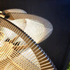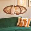 ETIOLA, une ellipse de sept branches de bois structurant un subtil motif de rubans de cotons tendus en tressage Twist, font de cette suspension une étonnante source de lumière aussi légère qu'aérienne.