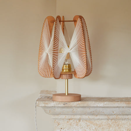 Collection of wood and brass table lamps, lampshades available in several designs.